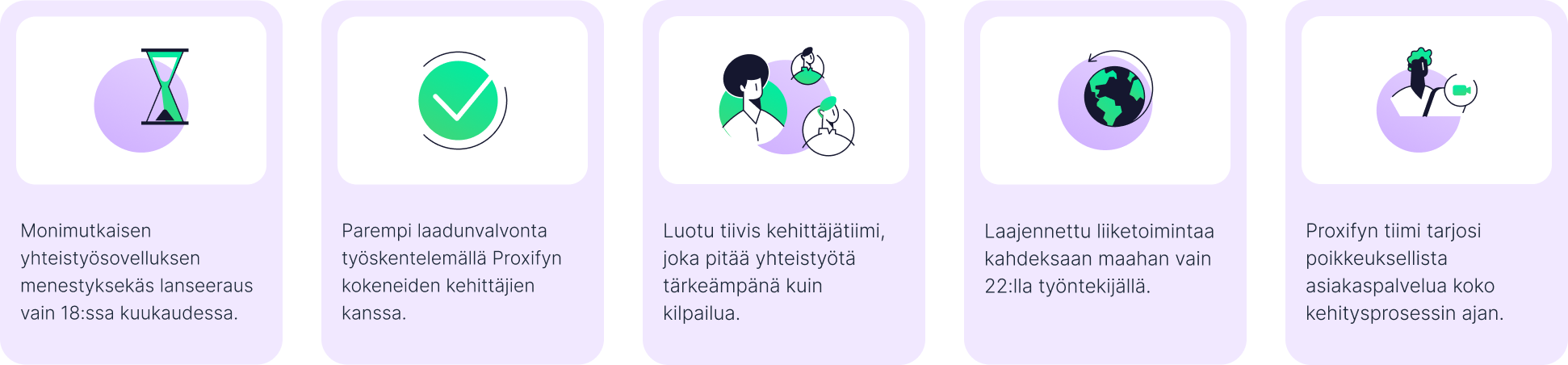 Hän oli myös innoissaan nähdessään, että Proxifyn tiimi todella ymmärsi heidän tarpeensa. Hän huomasi, että omistautuneet asiakaspäälliköt käyttivät aikaa keskustellakseen ja ymmärtääkseen heidän arvojaan ja löytääkseen kehittäjiä, jotka ymmärsivät täysin heidän visionsa ja tehtävänsä ja sopivat heidän työntekijäarvoihinsa.
